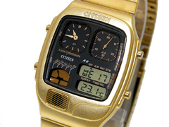 温度計とアナログ時計とデジタル時計が融合。0.1度単位で計測した温度をデジタル表示。アラームセット時刻の温度を自動計測して温度メモとして記憶可能です。ストップウォッチは1/1000秒まで計測可能な高性能タイプ。右側のアナログ表示部は秒表示・アラーム時刻・ローカルタイムの切り替えが可能。現代的なデザインのメタルウォッチです。